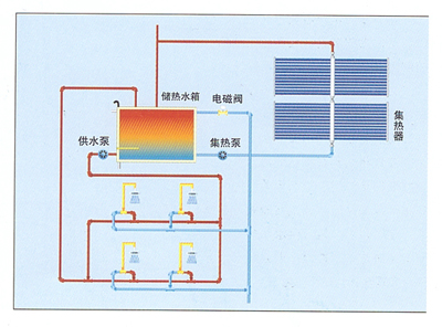 - 本系統中集熱器集中放置,設置滿足用戶需求容量的大型儲熱水箱,控制系統、循環裝置及其他輔助設...